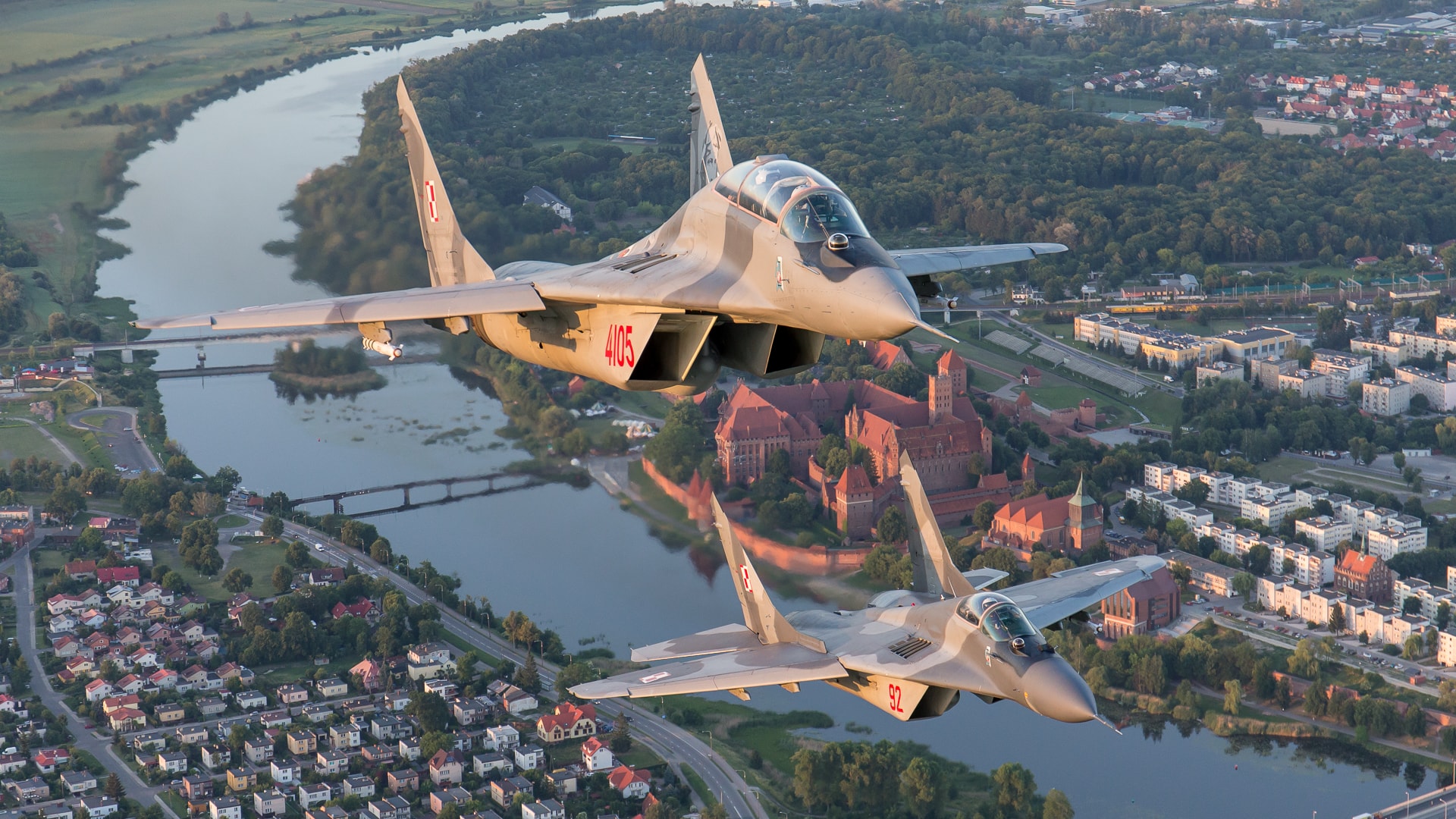 2x MiG-29 of Polish Air Force during a training flight in the area of Malbork Air Force Base, Poland