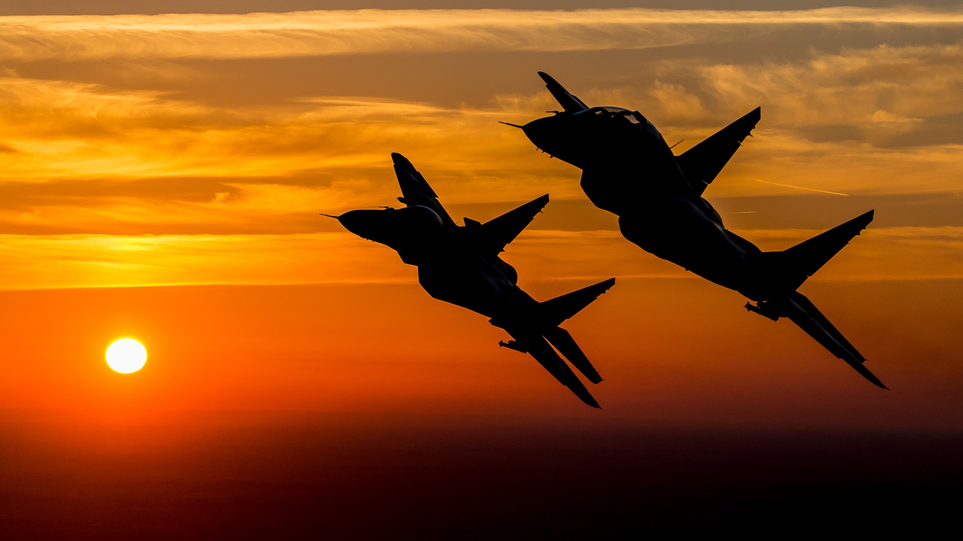 2x MiG-29 of Polish Air Force in the afternoon flight over Malbork Air Force Base, Poland