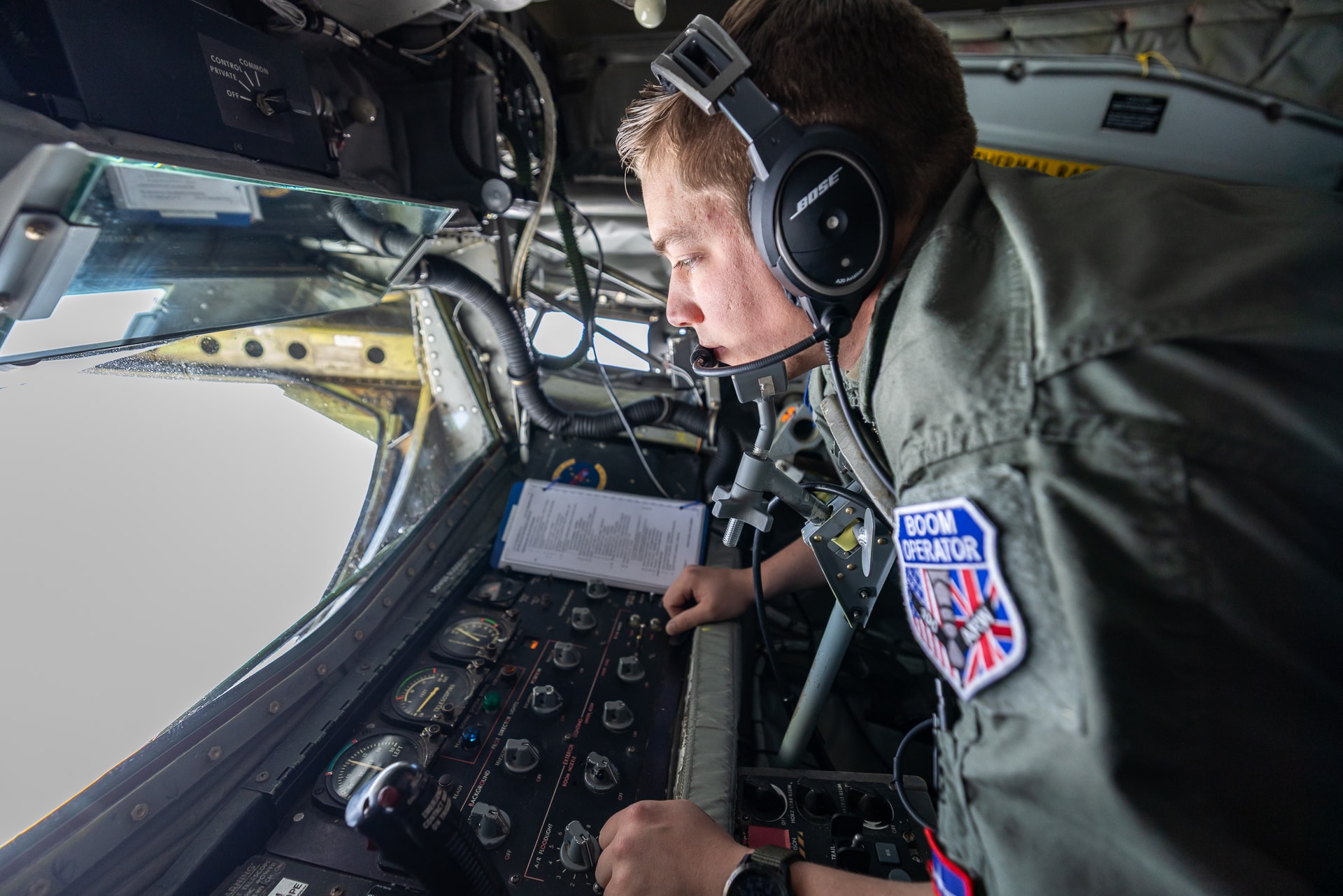 100th ARW Boom Operator preparing to deliver a gas to a receiver aircraft from KC-135