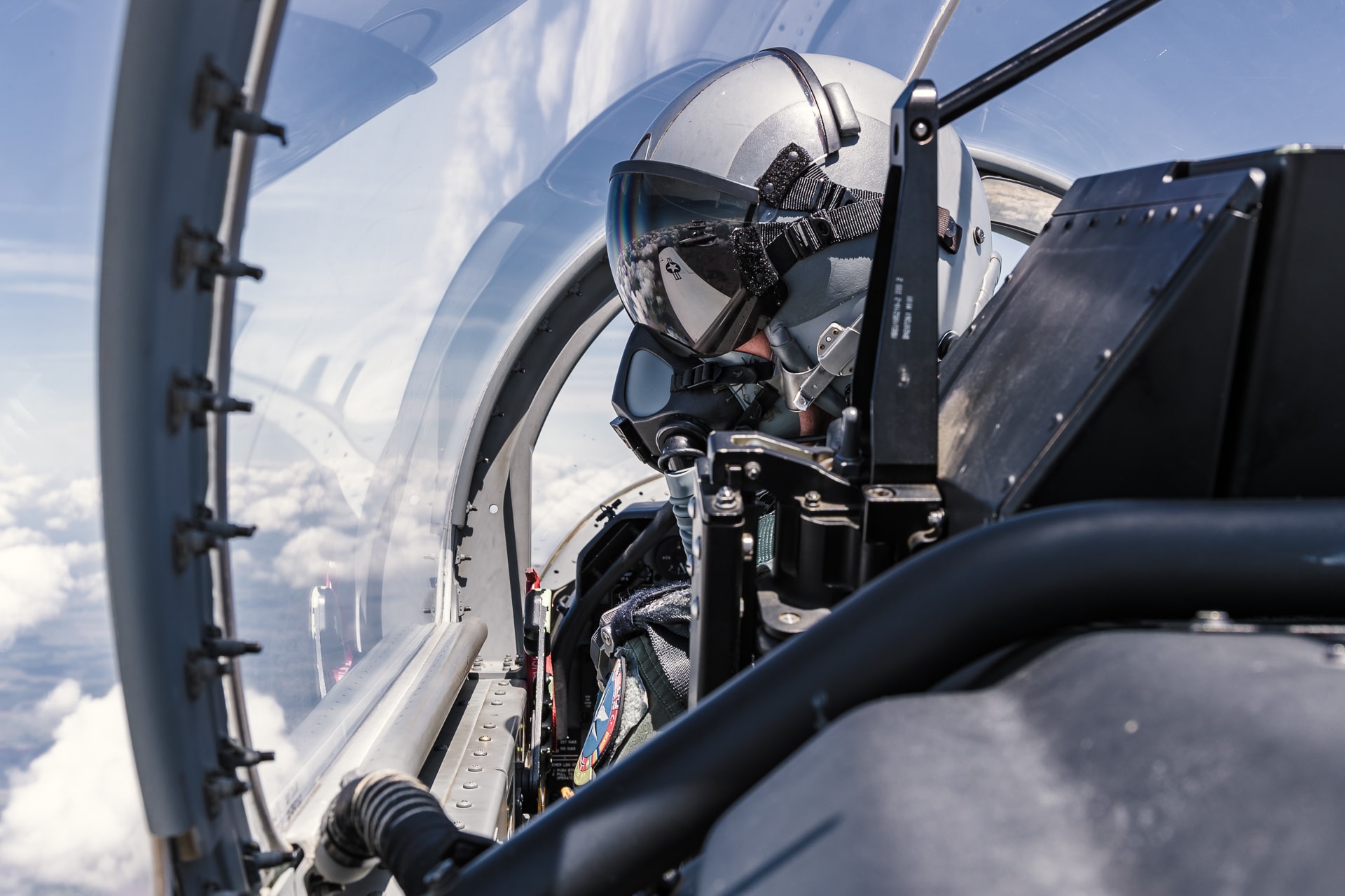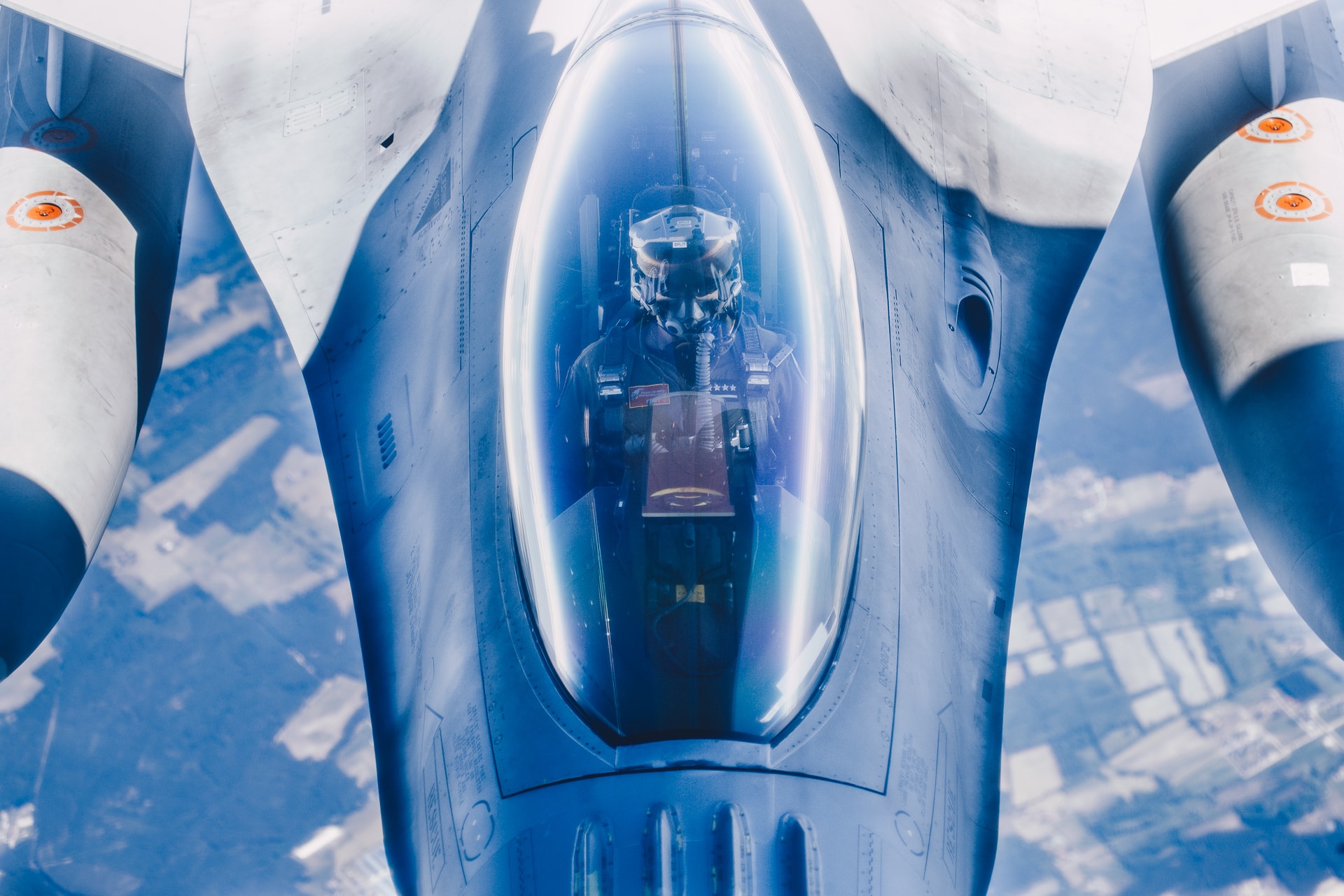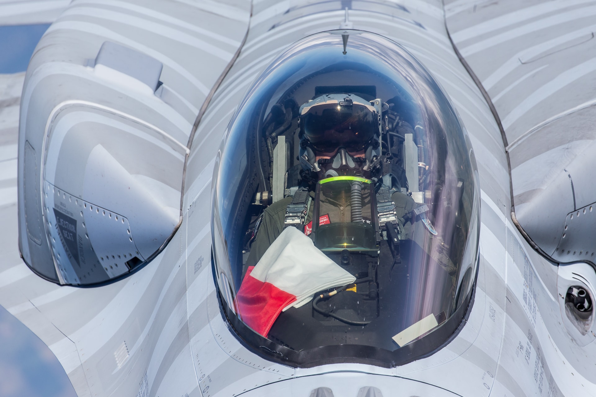 Close up view of Polish Air Force F-16 pilot during a training flight above Poland
