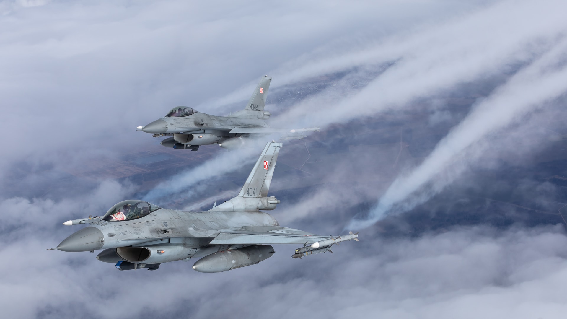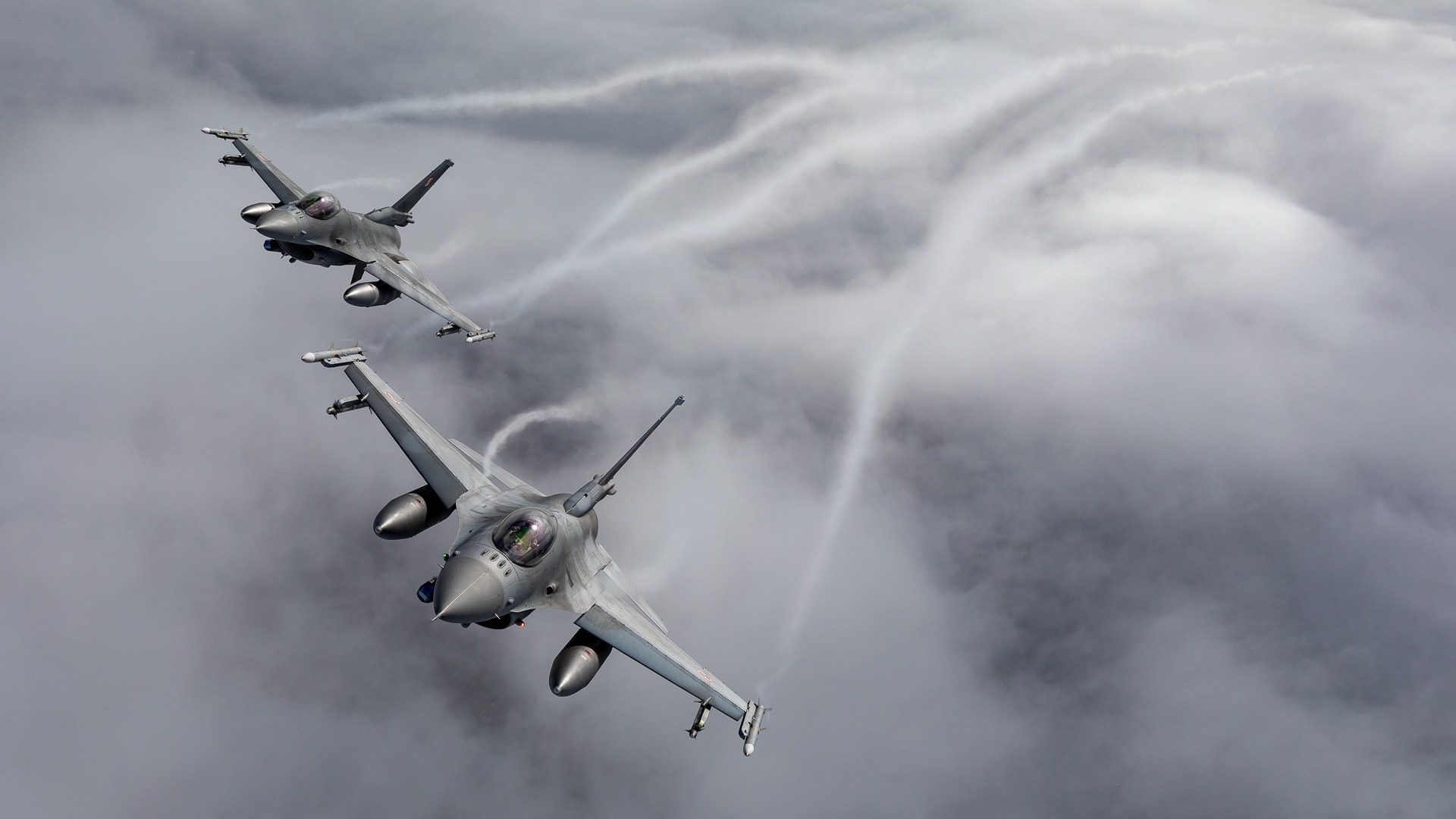 2x F-16 Polish Air Force with contrail smoke during a training flight as part of Baltic Air Policing mission in Lithuania