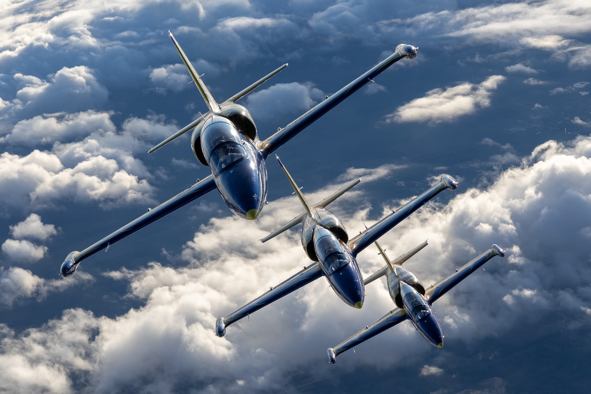 3x L-39 Albatros aircraft of Lithuanian Air Force during a training sortie over Lithuania