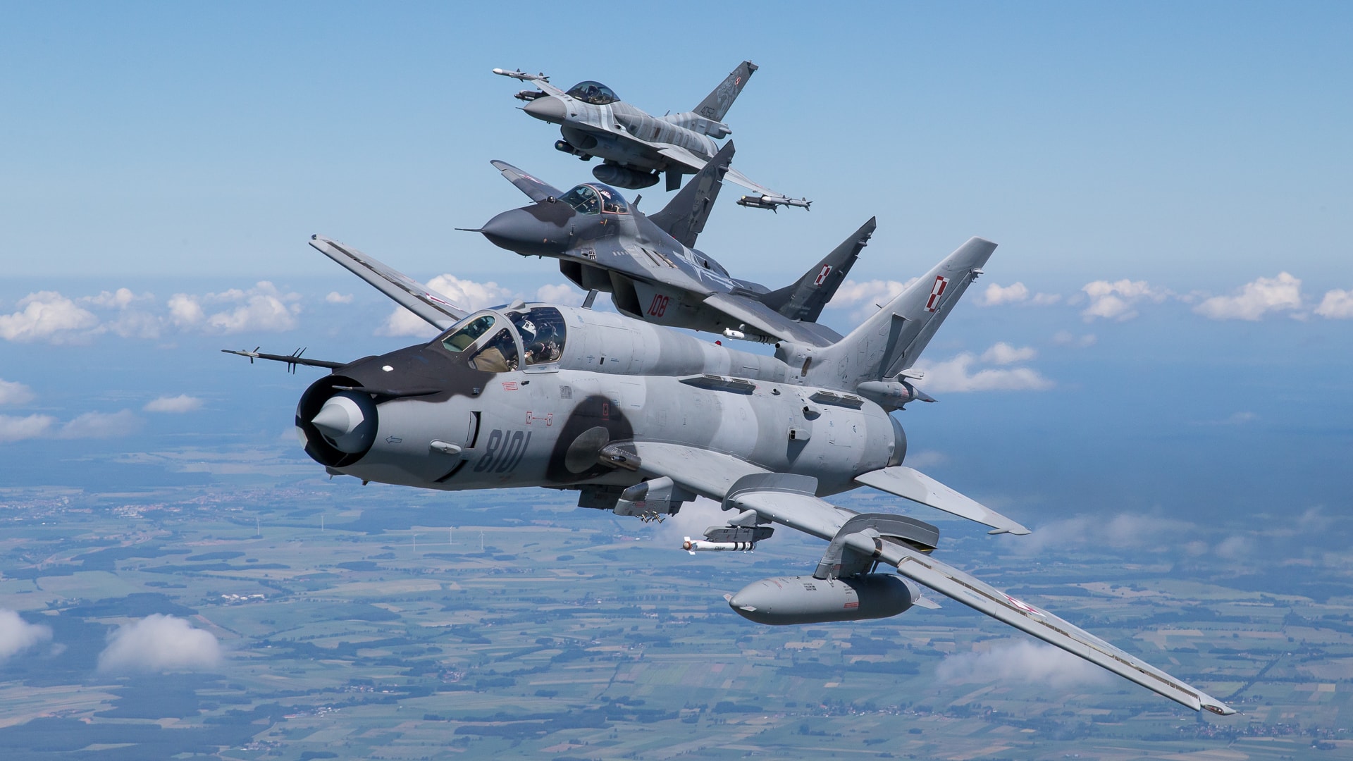 Main fighters of Polish Air Force in a dedicated joint flight of Su-22 + MiG-29 + F-16