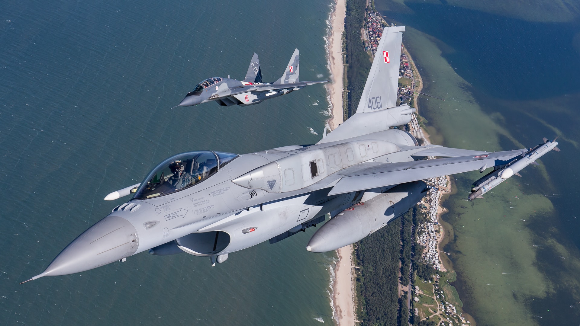 F-16 and MiG-29 of Polish Air Force during a joint training flight above Baltic Sea, Poland