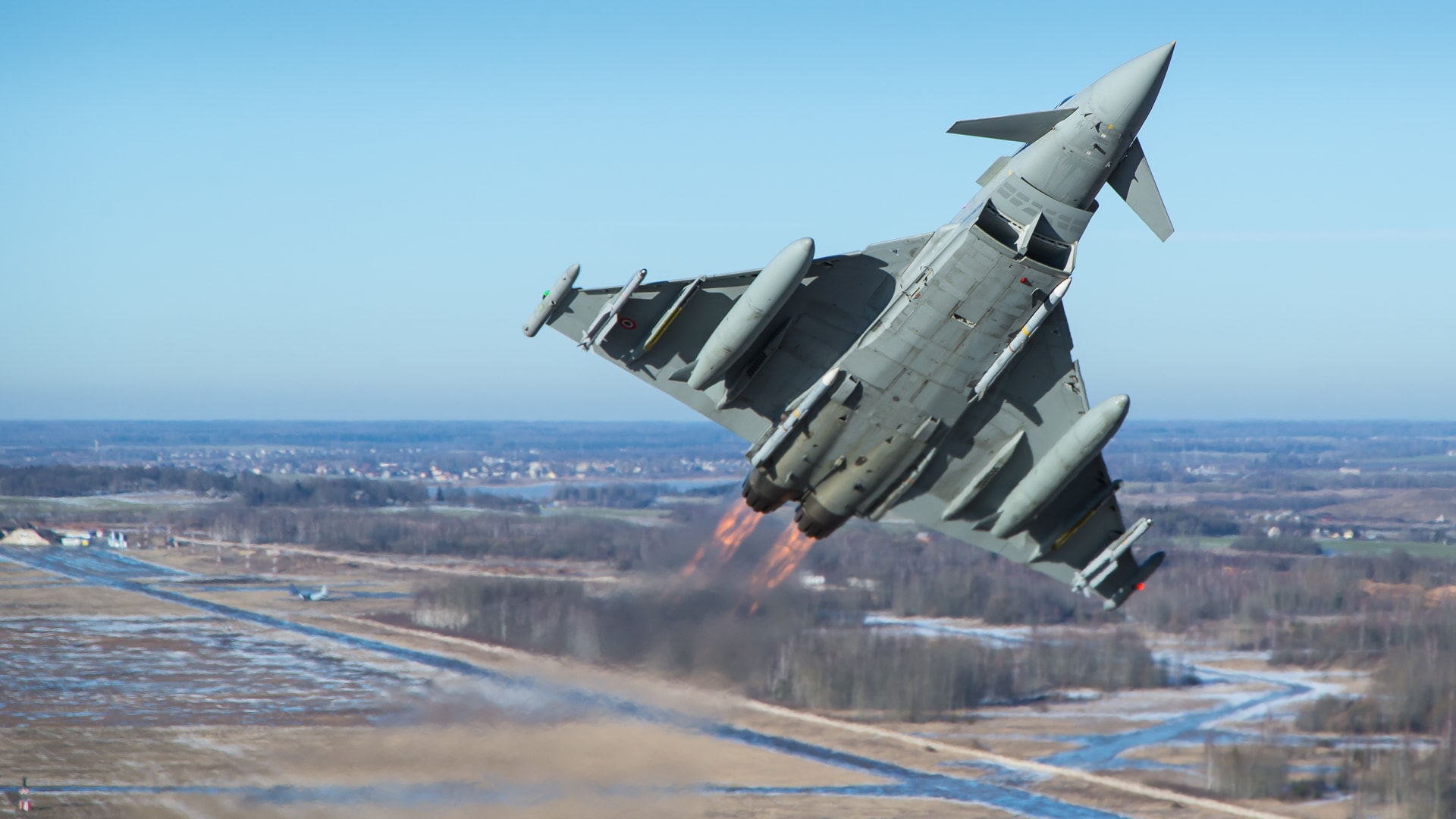 Eurofighter Typhoon of Italian Air Force taking off from Siauliai Air Force Base in Lithuania during NATO Baltic Air Policing mission