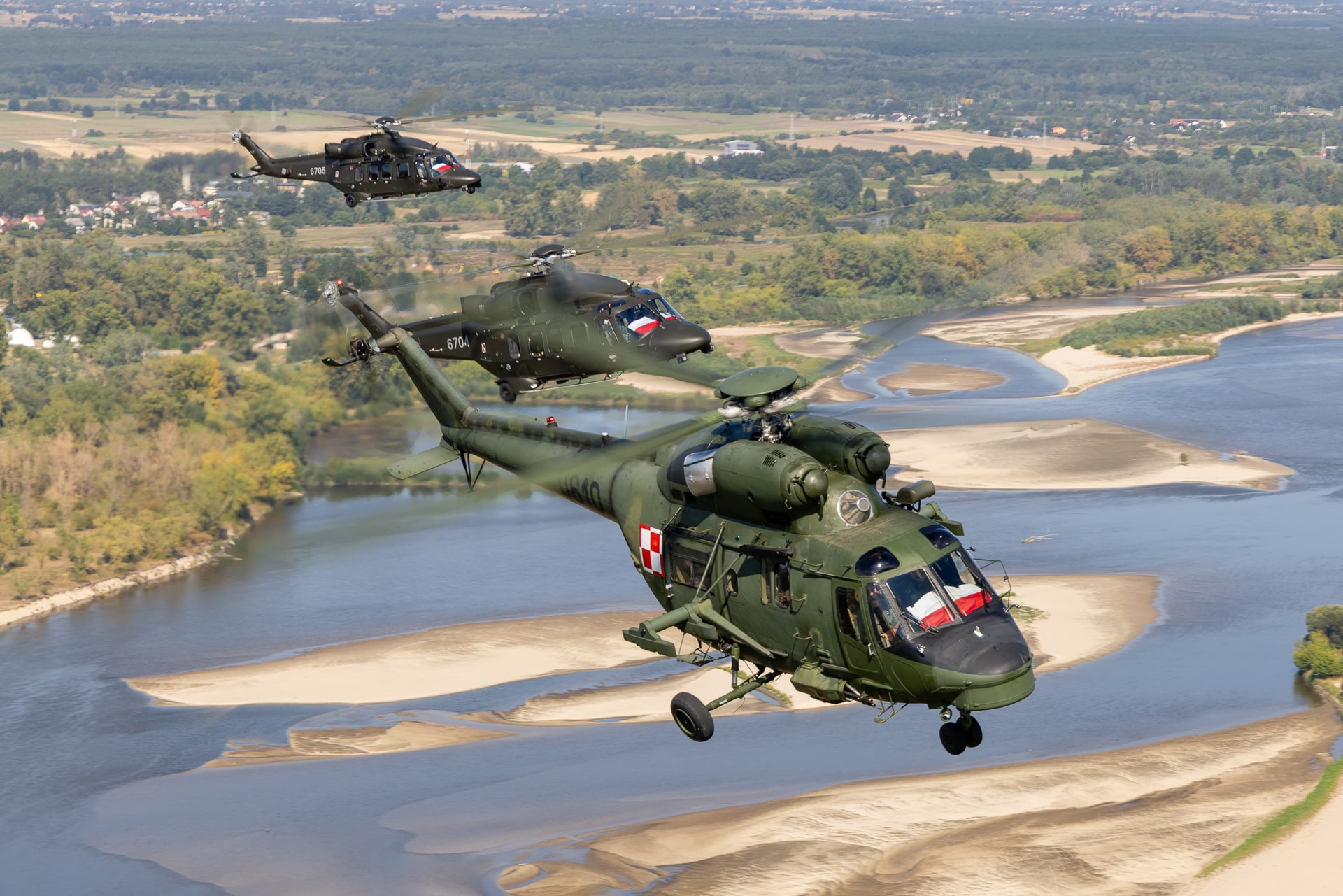 PZL W-3 and AW-149 helicopters of Polish Air Force from 25th Tactical Aviation Brigade during a flight over Poland