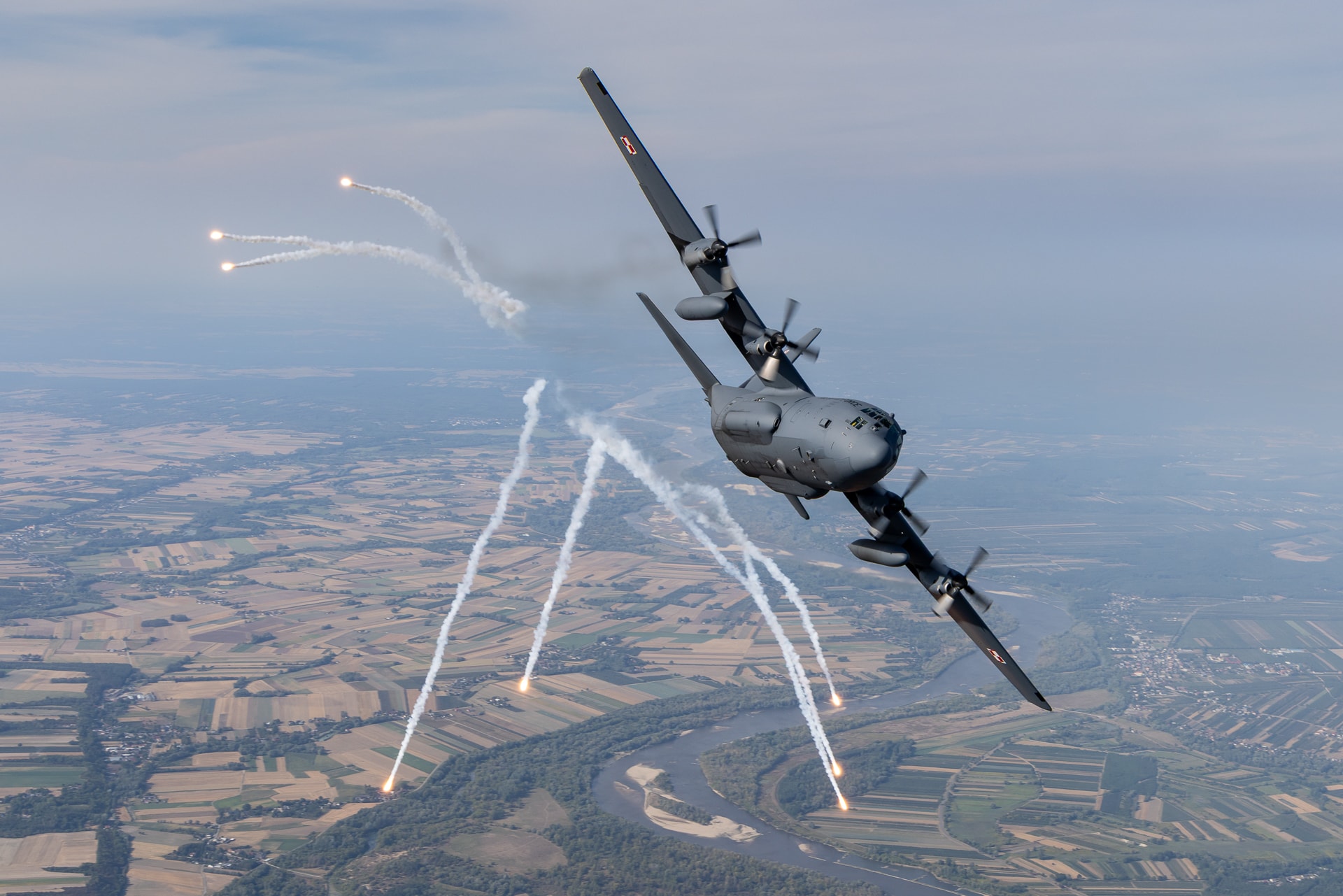 Lockheed C-130 Hercules of Polish Air Force releasing flared during a training flight above Poland